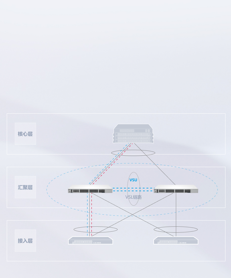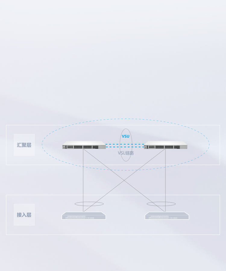毫秒级故障恢复:VSU和外围设备通过聚合链路连接,如果其中一台设备或者一条成员链路出现故障,切换到另一条成员链路的时间只需要50毫秒。