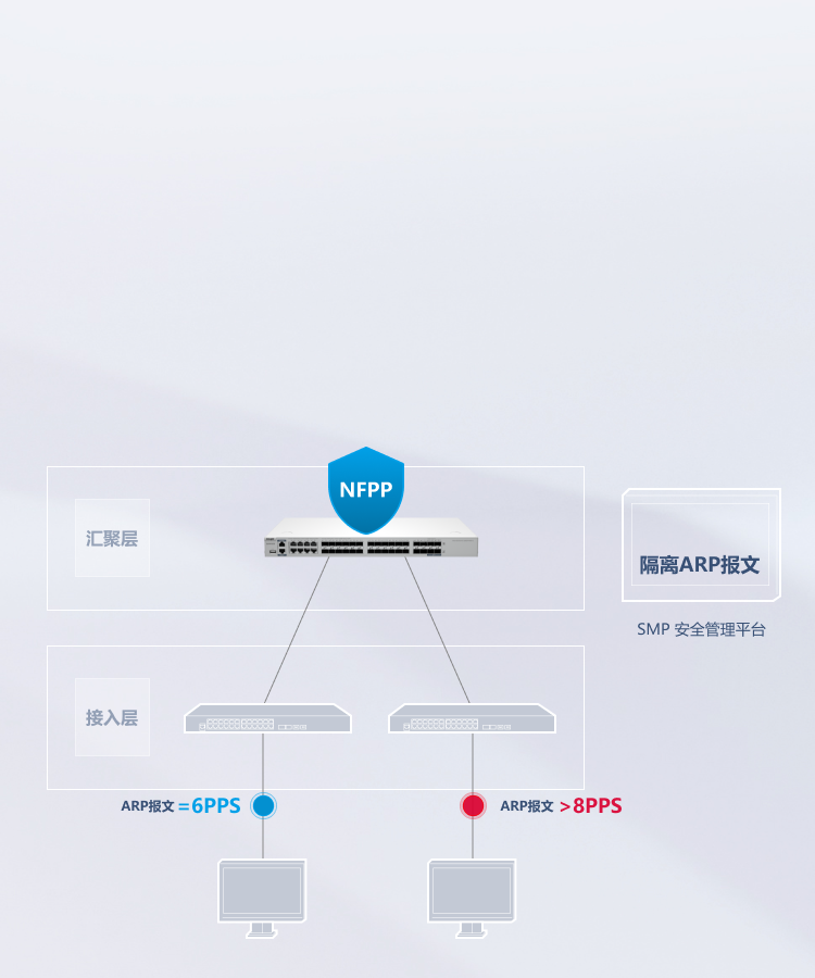 支持基础网络保护策略(NFPP,Network Foundation Protection Policy)技术,能够限制用户向网络中发送ARP报文、ICMP请求报文、DHCP请求报文等数据包的数率,对超过限速阈值的报文进行丢弃处理,甚至能够识别攻击行为,对有攻击行为的用户进行隔离。从而保护基础网络免受网络攻击行为的影响,保障网络稳定。