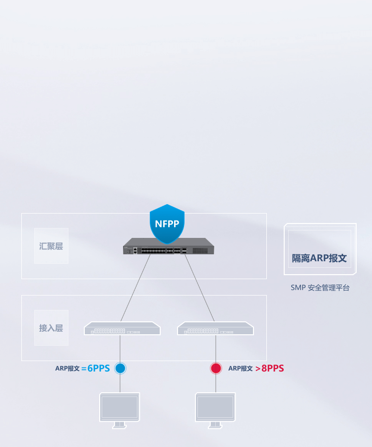 支持基础网络保护策略(NFPP,Network Foundation Protection Policy),用来增强交换机安全的一种保护体系,通过对攻击源头采取隔离措施,可以使交换机的处理器和信道带宽资源得到保护,从而保证报文的正常转发以及协议状态的正常。