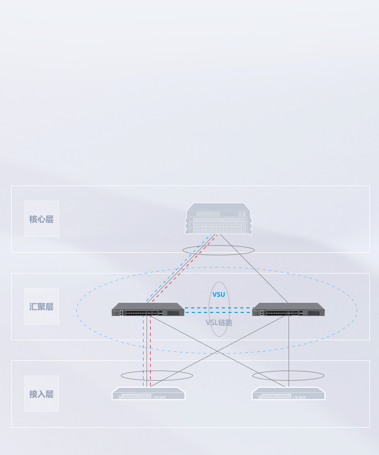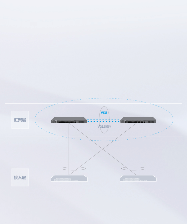 毫秒级故障恢复:VSU和外围设备通过聚合链路连接,如果其中一台设备或者一条成员链路出现故障,切换到另一条成员链路的时间只需要50到200毫秒。